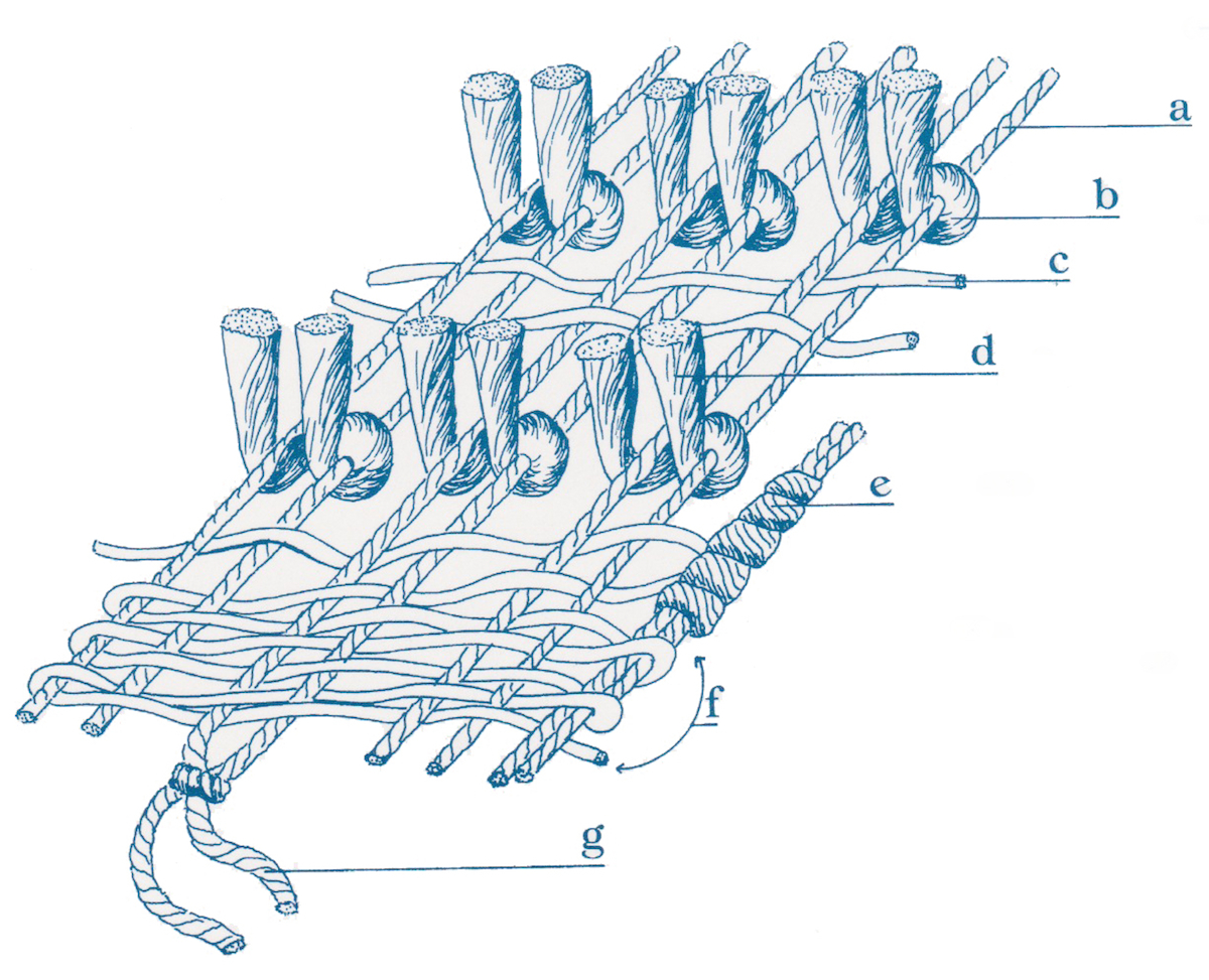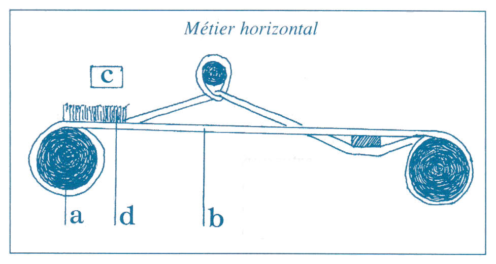a : poutre b: chaîne c: place du noueur d: brin de laine qui constitue le velours du tapis e: fil de chaîne enroulé |