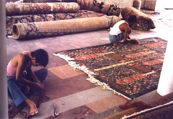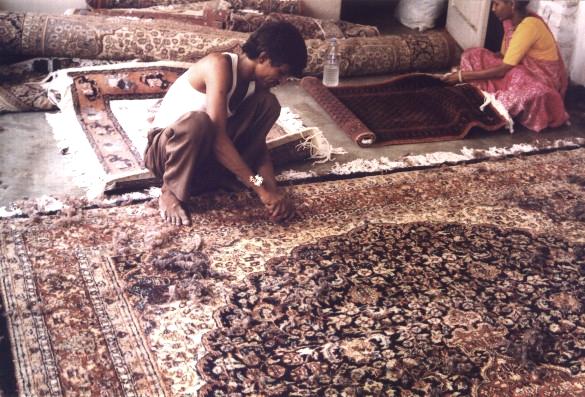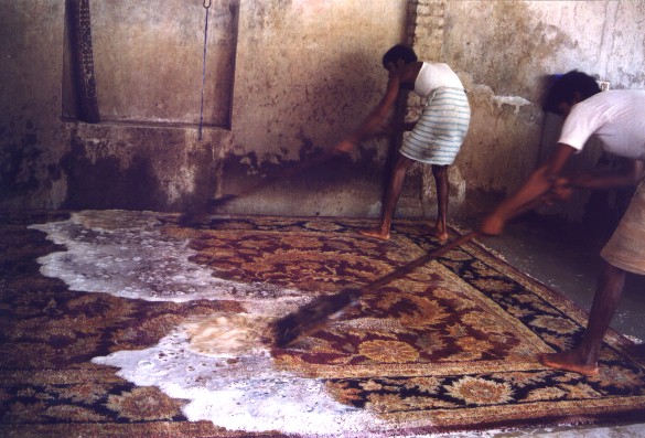 Cette opération du lavage est destinée à enlever toute raideur au tapis, à éliminer l'excédent de la "bourre"(voir F.A.Q) et à restituer à la laine ainsi qu'aux coloris leur fraîcheur première. Le tapis est ensuite étendu au soleil pour sécher, ce qui permet d'éprouver une dernière fois les couleurs.