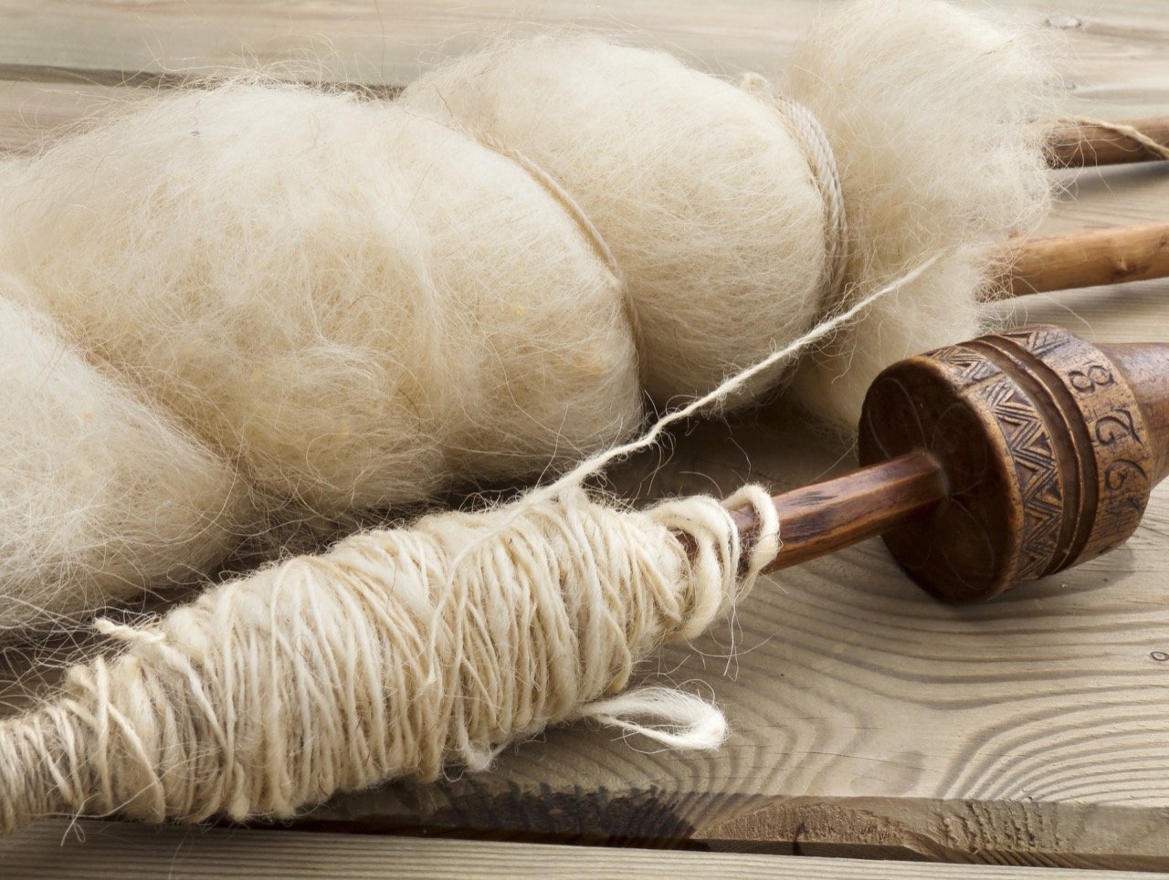 | Filage de la laine avec un fuseau. Les écheveaux de laine peignée sont enroulés autour du poignet de la tisserande qui, de l'autre main, tire doucement un fil régulier, au fur et à mesure que tourne le fuseau.. Pour cela, elle doit faire tourner son instrument dans le sens contraire à celui du filage. | |