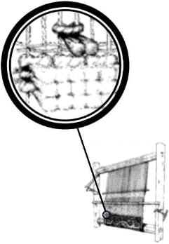 Lorsqu'une rangée de nœuds est terminée, on passe la trame pour tenir le velours; elle passe alternativement au-dessus et au-dessous des fils de chaîne.