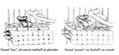 En effet, le turkbaff ou nœud turc (nœud symétrique), est employé essentiellement en Turquie et dans le Caucase; le farsbaff ou nœud persan (nœud asymétrique) est utilisé surtout en Perse. Il est par ailleurs curieux de constater que, dans la petite ville de Senneh (ou Sanandaj), qui donne son nom au nœud persan, les tapis sont noués au nœud turc.